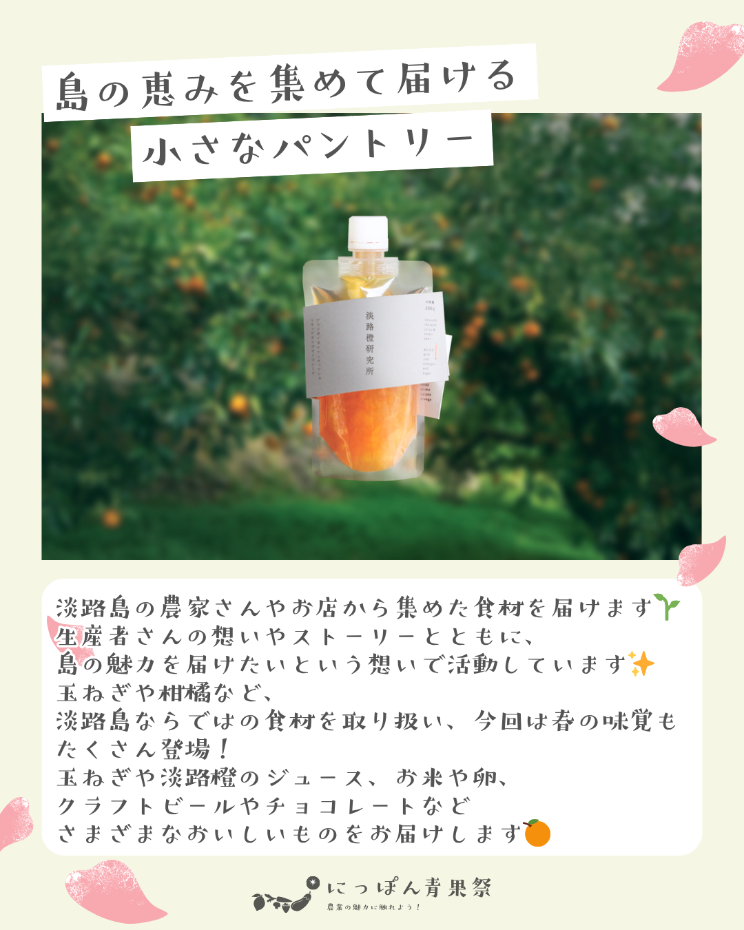 淡路島の農家さんやお店から集めた、おいしいものと暮らしを少し楽しくしてくれるアイテムをお届けします。