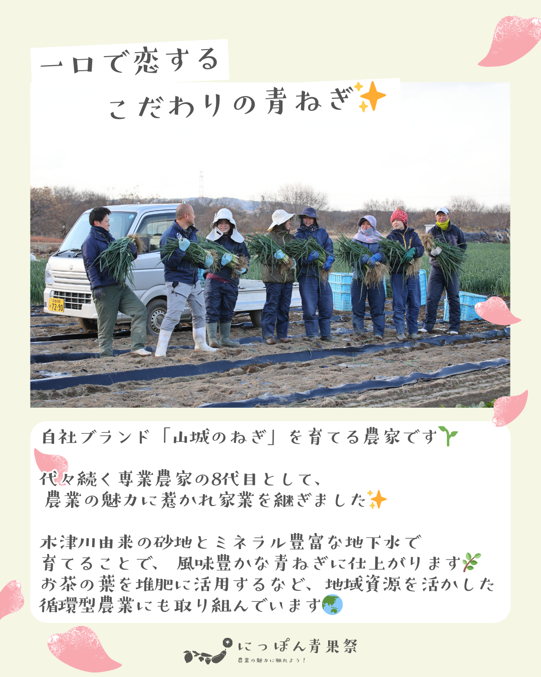 町を流れる木津川由来の良質な砂地と、ミネラル豊富な地下水を使用して生産する事で、風味豊かな青ねぎを生産することが出来ます。また、名産のお茶の葉を堆肥として使用するなど、資源の地域内循環にも心がけています。