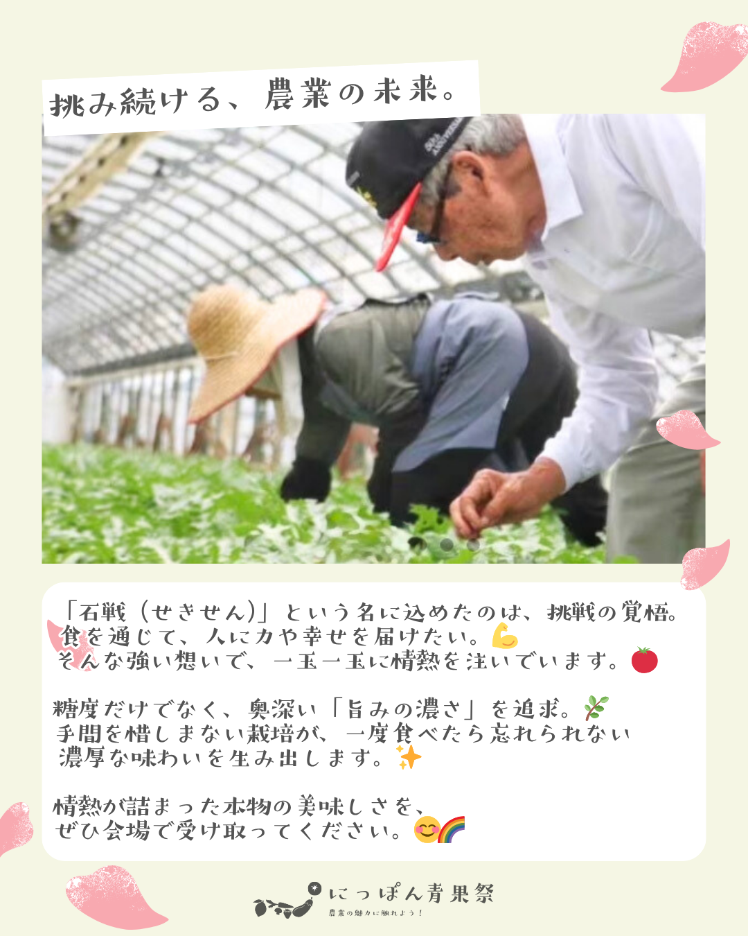 そして農業のイメージを変え、これから挑戦していく若い人たちのきっかけになるような存在を目指しています。